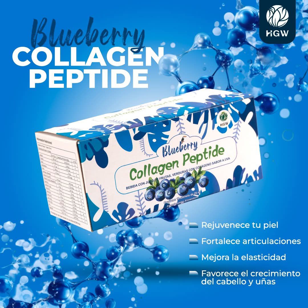 Blueberry Collagen Peptide de HGW es una bebida funcional en formato de sachet (25 g), elaborada con concentrados de frutas y verduras —como arándano, cereza y kiwis— y enriquecida con péptidos y tripéptidos de colágeno, vitaminas y minerales esenciales. Su presentación es práctica, segura y fácil de incorporar en la rutina diaria.